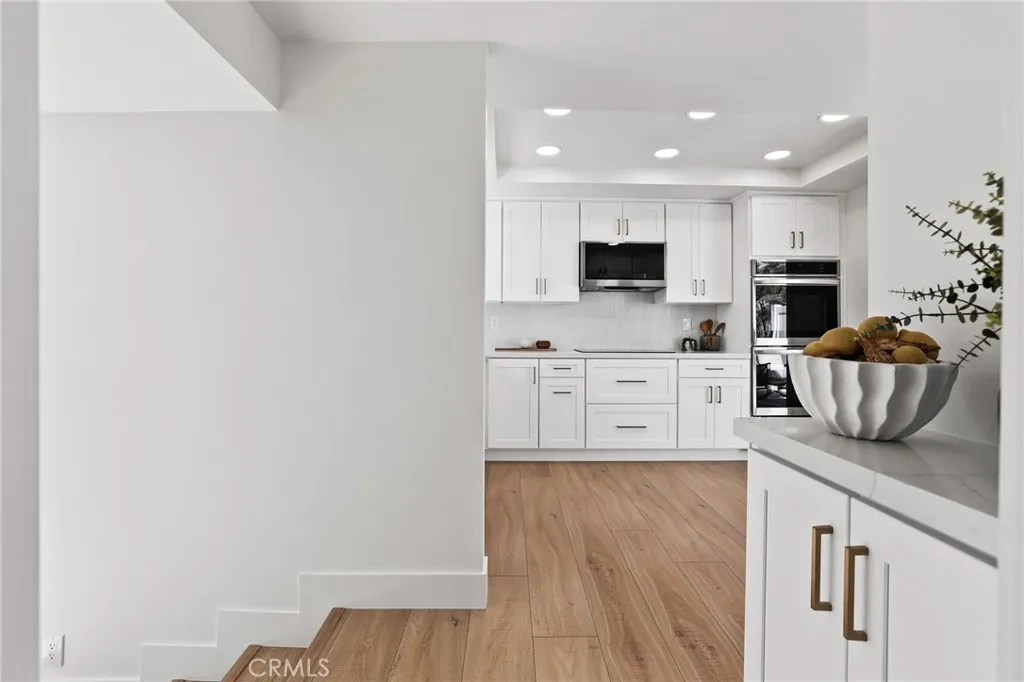 Stunning inside and out, this newly remodeled home sits on a quiet cul-de-sac in a prime Woodbridge locationwell within the loop and a short walk to Stone Creek Elementary, Lakeside Middle, Woodbridge High, the lake, and Woodbridge Center. Excellent curb appeal with a newer roof (approx. 4 years), new driveway and walkways, updated garage door, refreshed landscaping with new sprinklers and drip system, new windows, and a 6-ft privacy gate. Inside, the open, airy layout features abundant natural light, high ceilings, and a modern design. The first floor boasts wide-plank white oak flooring, new paint, baseboards, window casings, recessed lighting, and newer ceiling fans. The living room centers around a striking fireplace, while the spacious dining room overlooks the backyard with a dramatic light fixture. The fully remodeled kitchen offers new white shaker cabinets, quartz counters, a stainless-steel LG appliance suite, and champagne bronze fixtures. The family room opens to the backyard, providing a bright, inviting space for gatherings. Downstairs also includes a remodeled bath with new flooring, vanity, and custom shower door, plus a bedroom with atrium views. Upstairs, enjoy new carpet and padding throughout. Secondary bedrooms are generously sized with ceiling fans, and the updated hall bath features a new double vanity, quartz counters, flooring, and shower door. The large primary suite offers vaulted ceilings, new recessed lighting, ample closet space, and a spa-like bath with an oversized double vanity, quartz counters, new fixtures, flooring, and a custom walk-in s