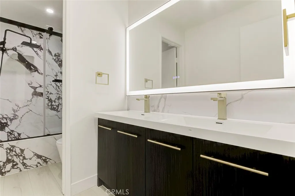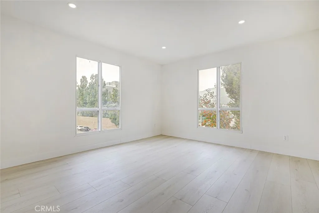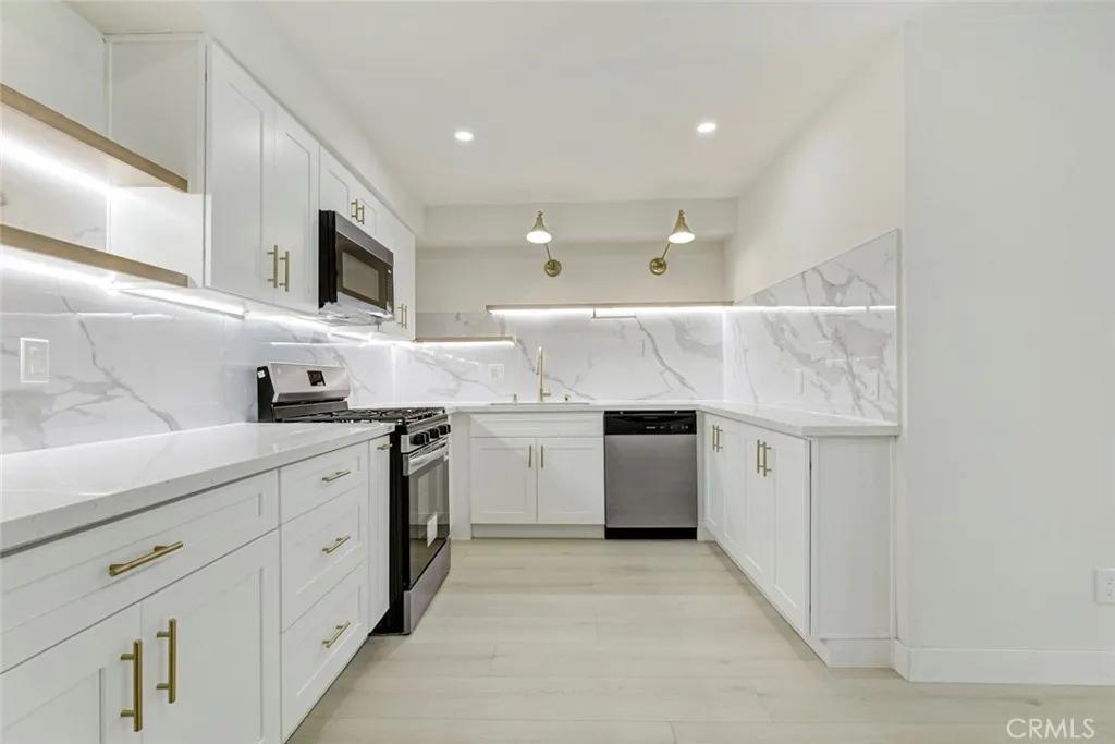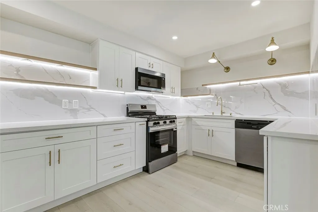 Fully renovated corner, one-level 2-bedroom, 2-bath condo in a prime location in Glendale! Smooth ceilings (popcorn removed), recessed lighting, wide-plank flooring, and a bright neutral palette create an open and comfortable living space. The living room is spacious and filled with natural light, opening to a private balcony with open mountain views and an elevated outlook toward the 134 freeway corridor. With quality windows in place, interior noise impact is minimal, while the elevated exposure provides openness, views, and natural light. As a corner unit, the home also benefits from added privacy compared to interior units. The kitchen has been completely updated with white shaker cabinetry, quartz countertops, a full-height designer backsplash, under-cabinet lighting, and stainless steel appliances. Both bathrooms feature modern vanities, illuminated mirrors, contemporary fixtures, and updated designer finishes. Bedrooms are well-proportioned with good natural light and flexible use. Additional highlights include central air and heat, elevator access, two side-by-side parking spaces conveniently located near the elevator, a secured lobby, and a community pool. While the unit does not have in-unit laundry, the on-site laundry room is located very close to the unit and offers multiple washers and dryers operated via mobile app, providing a convenient and efficient setup. The well-maintained community has also seen recent improvements, including new floors on hallways, a resurfaced pool, recreation/media room, and a newer roof. Plenty of street parking available. Well loc